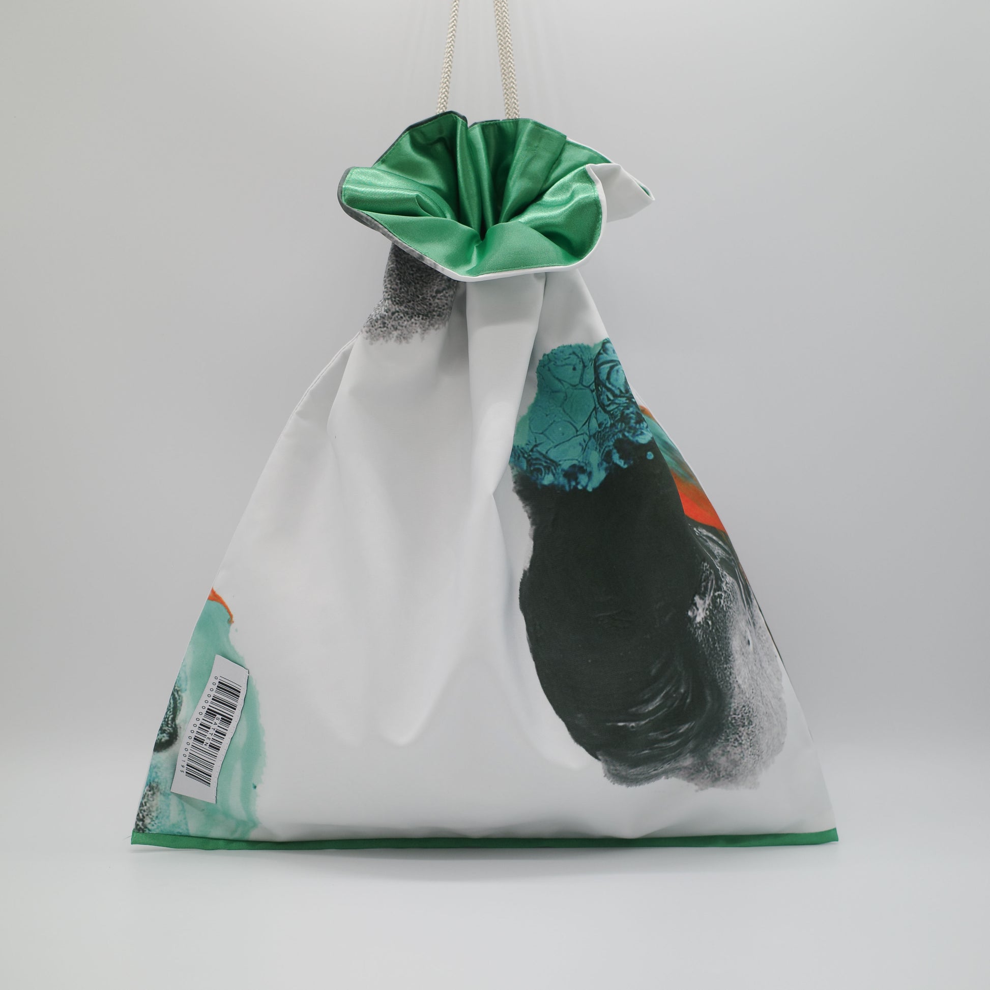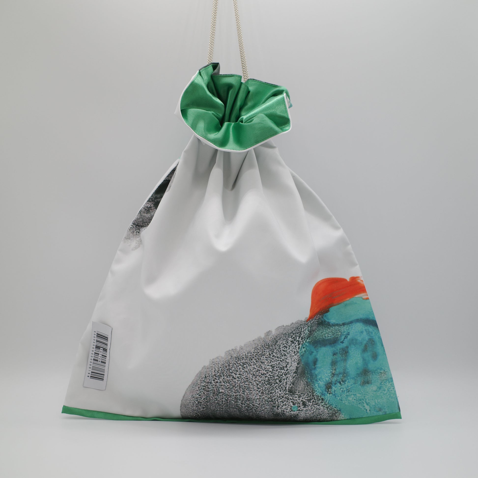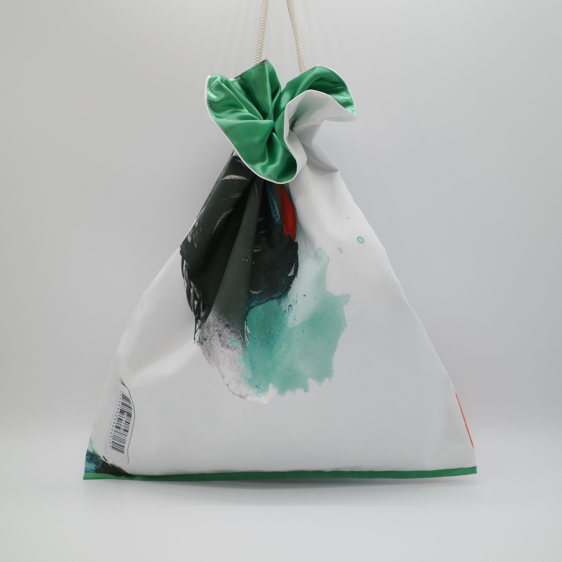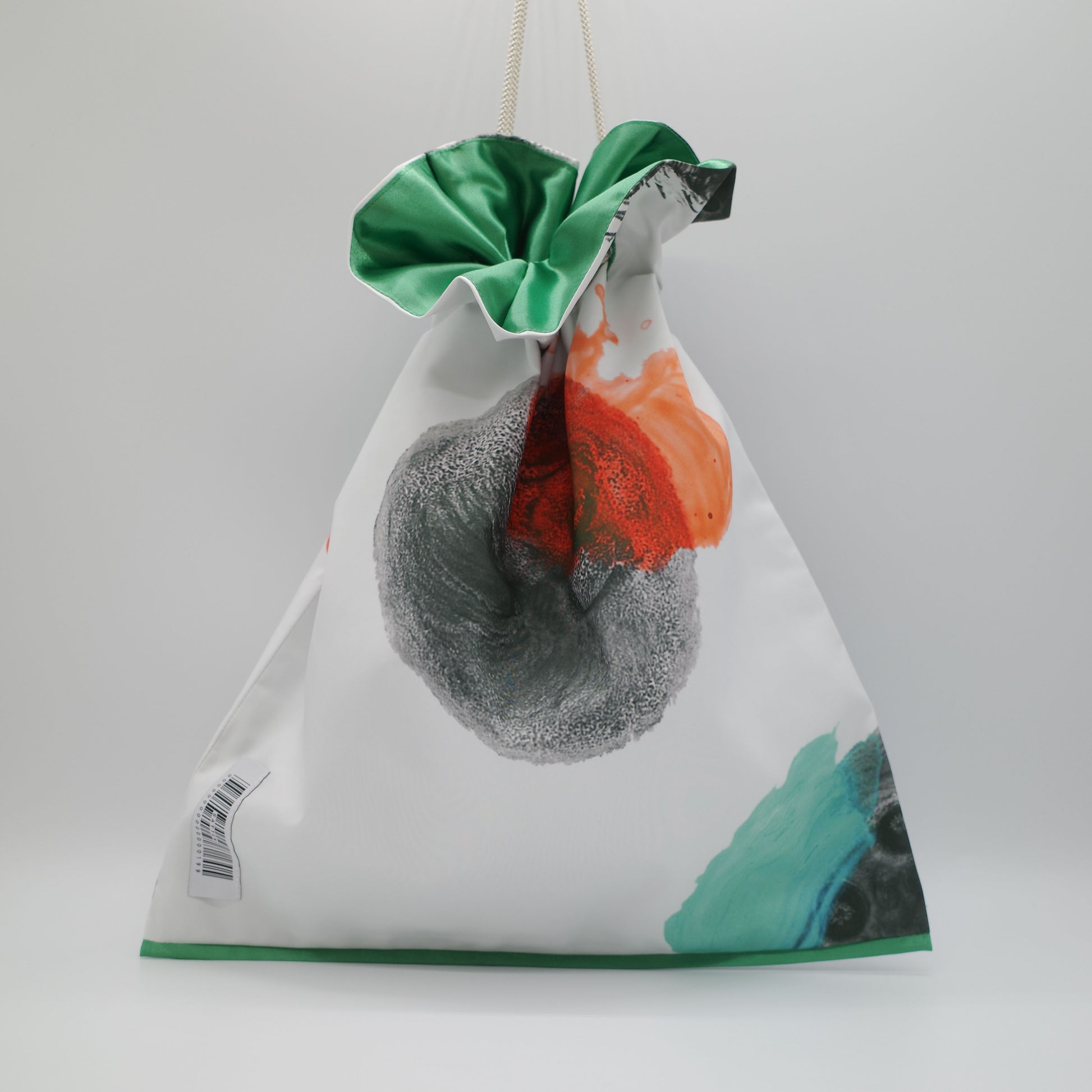 アートのかけら×カラフルな裏地・紐の組み合わせによって作られたSattenでしか手に入らないBag。1点ものの記しとなるシリアルナンバーが縫い付けられています。